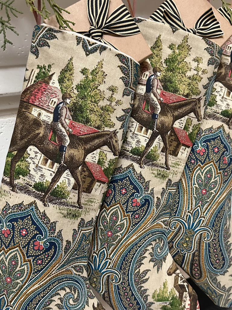 Because each stocking is handcrafted, variations will occur, making each textile one of a kind. Please note that we aim to include at least one horse image on each stocking; the placement of the horse graphic on the paisley-printed fabric will vary.